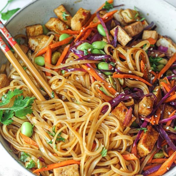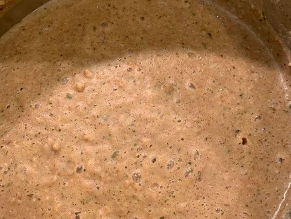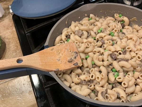 -Add 1/2 a can coconut milk, 2 tblsp nutritional yeast, 2 tblsp tahini, 1/2 tsp salt, 1 tsp cumin, juice of 1/2 a lemon, 3/4 cup green peas and 1/4 cup vegan Parmesan (or non vegan). Add cooked noodles.